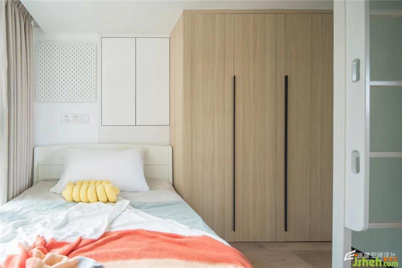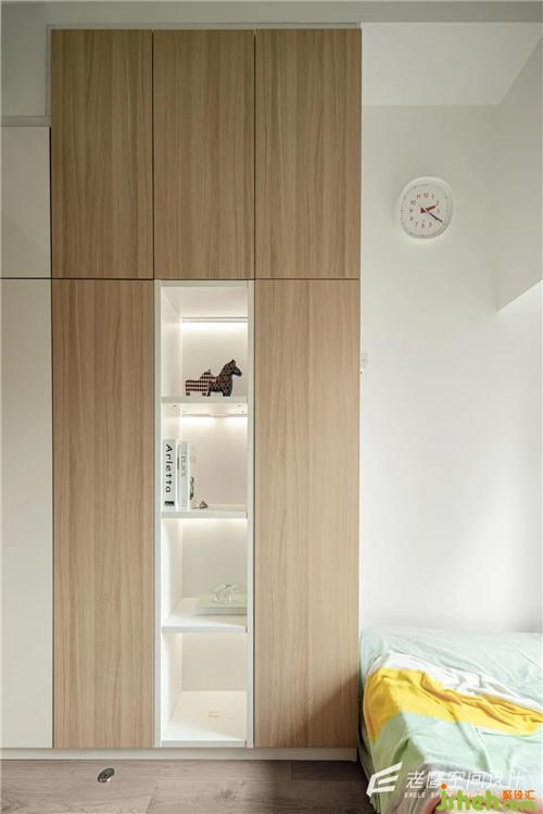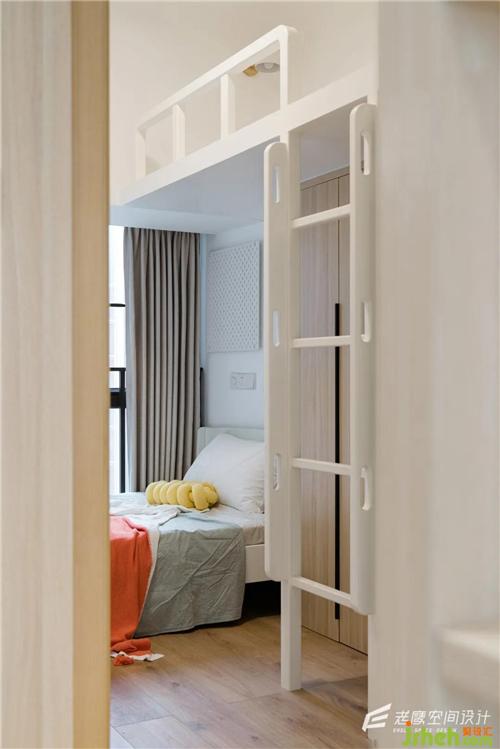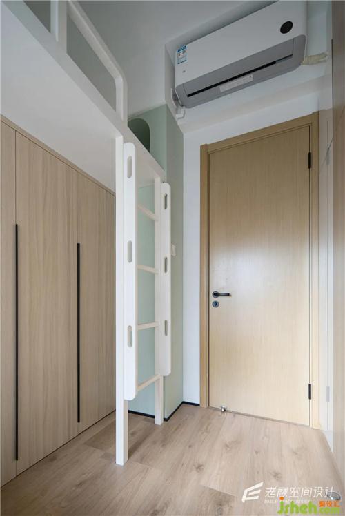 另一边也是柜子作为下铺的主要储物区域,为了避免储物柜给空间带来的压迫感,在中间区域特意做了开放区域,靠门的位置为白色的柜子,两种颜色搭配在视觉上更轻松~