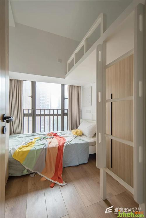 儿童房是错位上下铺的设计,上铺的底部为衣柜区域,小小的空间也可以满足储物和日常使用的功能深圳室内设计师,整个空间内部还是以白色+木色为主,加上果绿的色调点缀,软装上用比较童趣的彩虹色,氛围感十足