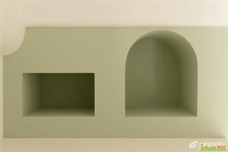 在上铺的区域制作了两个可爱造型的凹洞,可作为上铺的床头柜使用或者放置一些小物件。果绿色的墙体作为体块独立的存在,选用了其他颜色,给空间内部增加一些童趣的氛围~