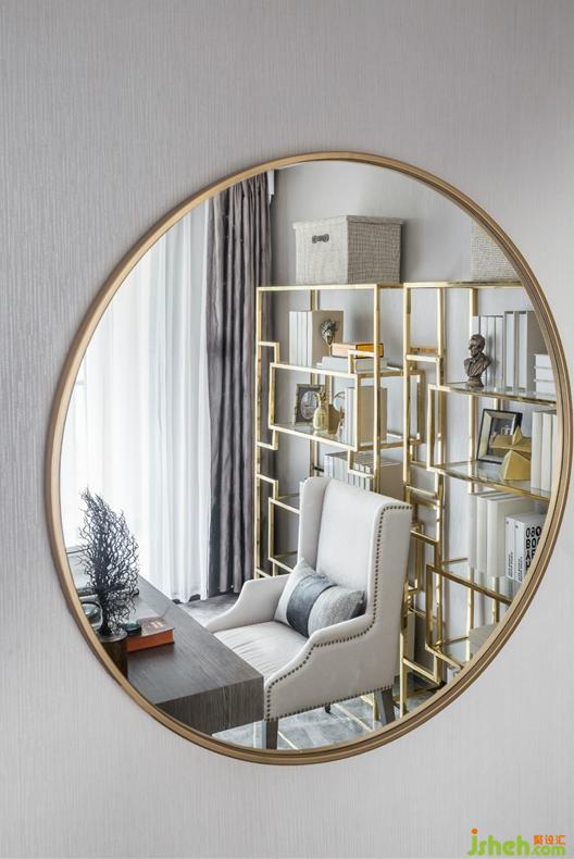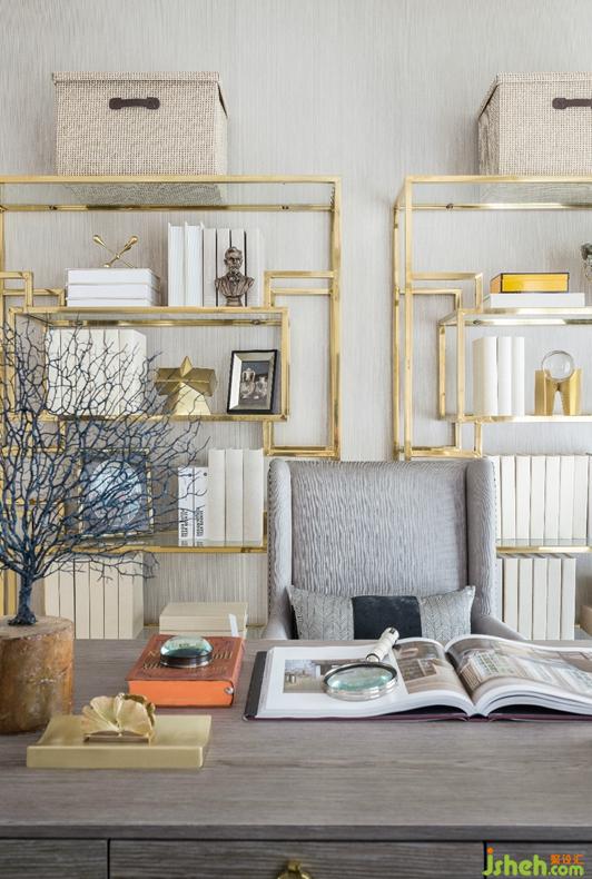 书房与客厅连成一体,通透之余亦构成一个开放式书房。金色置物架打破了空间的沉闷,从雅致跳脱出轻奢感。