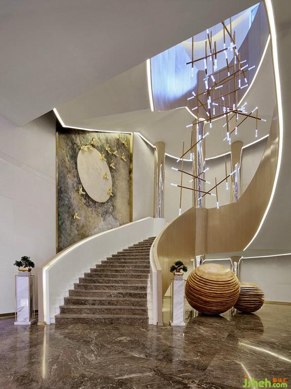 拾级而上,飞鸟循着光影似要冲出画面之外,实木雕刻的圆形装置用自己的素有气质,为空间注入艺术气息。