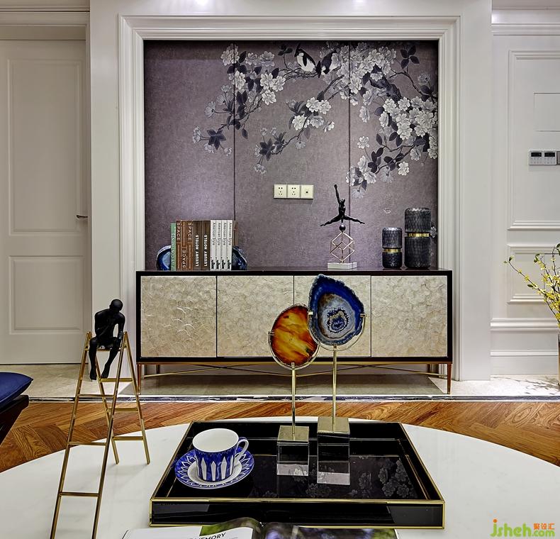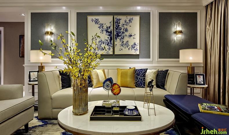大理石+金属+水晶 尽显简约时尚 , 整体空间色调以灰色,蓝色+黄色 为主,打造出温馨,舒适的居住空间。