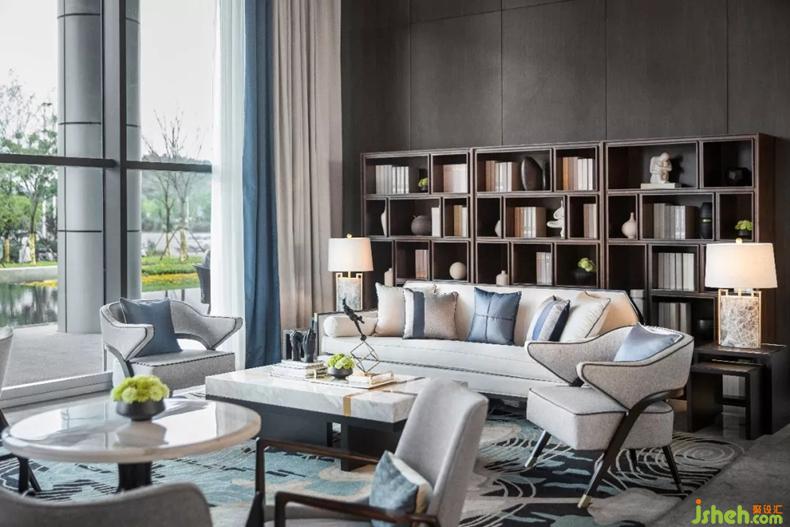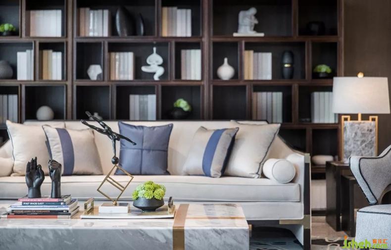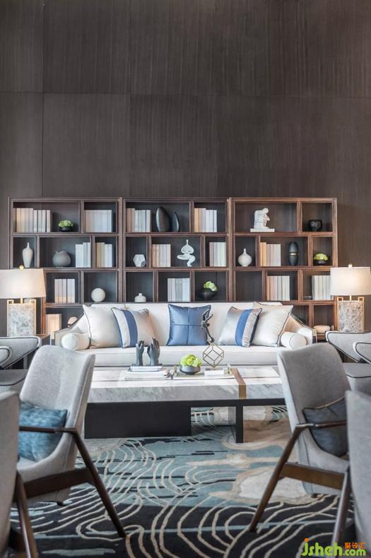 窗外绿意一览无遗,窗内是雅致舒适的生活之境,木质书柜富含韵味之余亦不失现代感。