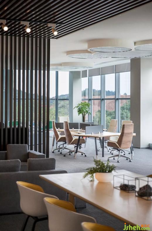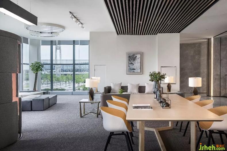 木栅排布出空间的疏密节奏,半开放式的环形洽谈屋保证了私密性,一方一圆之间亦不失东方朴质的美学风韵。