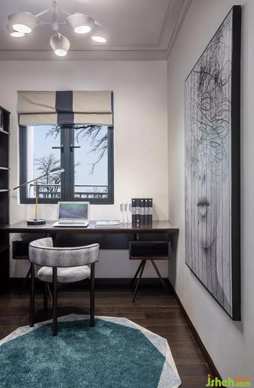 藏青色地毯与水墨色人像装饰画蕴含着安稳与沉静的力量,在明媚午后,手持书卷,独酌清茶,悠闲自在。
