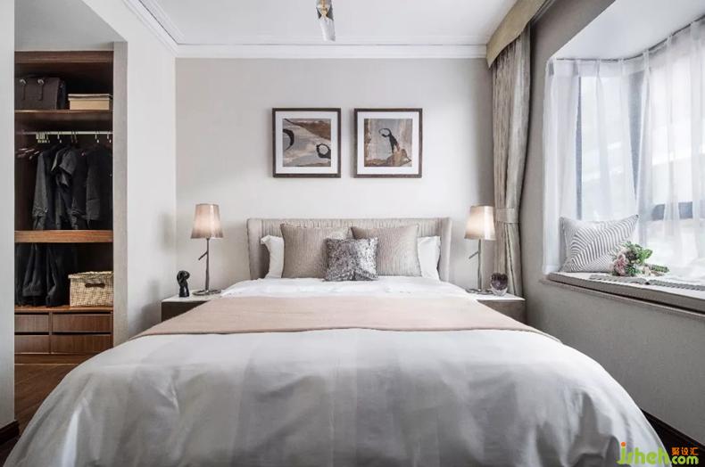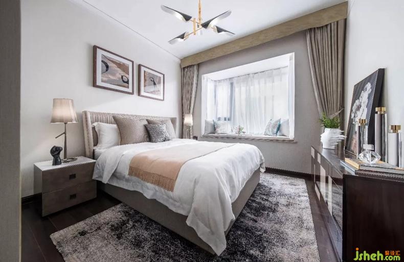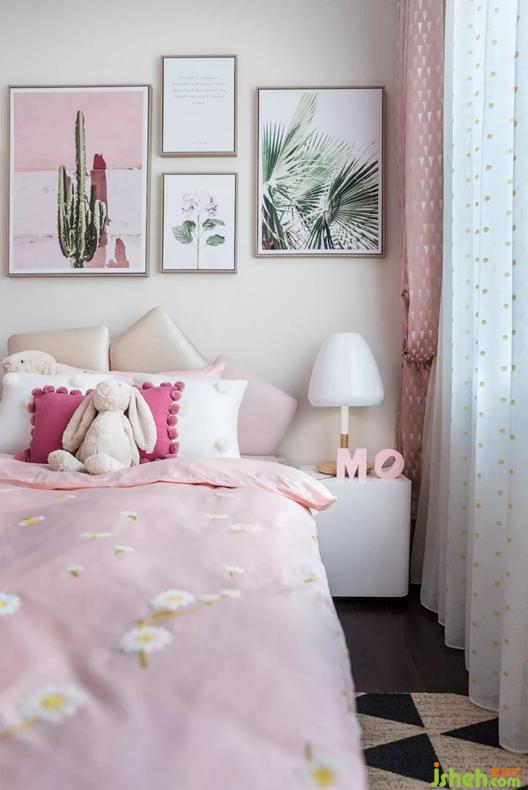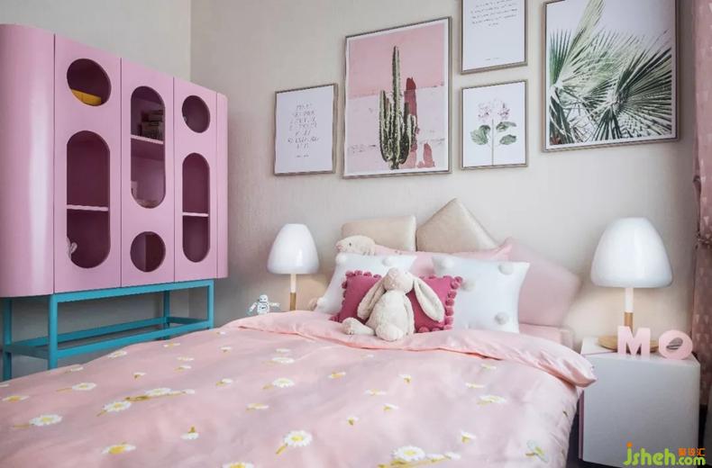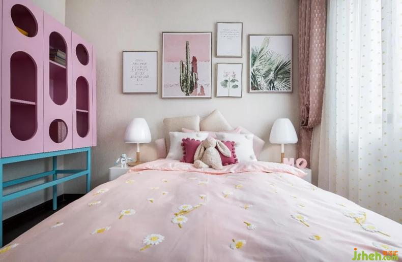 睡眠空间可以很优雅,也可以很知性。设计师保留米色背景,再选用海星蓝、香槟金、橡皮粉等床品,营造浪漫、柔和的氛围。
