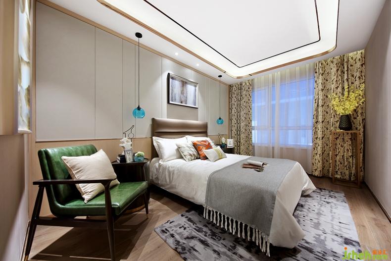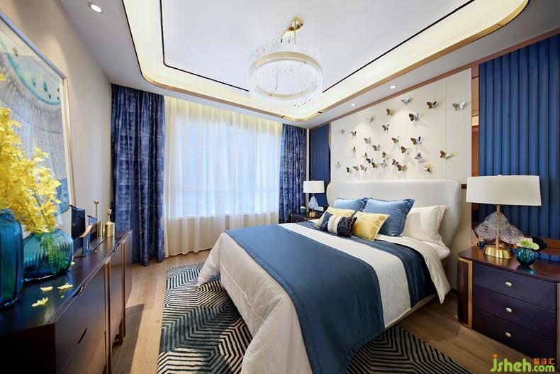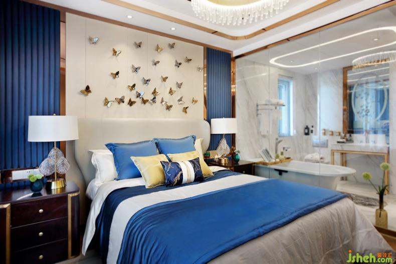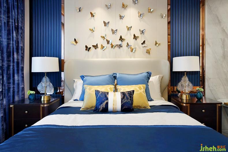 卧室床头翩翩欲飞的蝴蝶,搭配蓝白色调床品,让人与大自然更加亲近。
