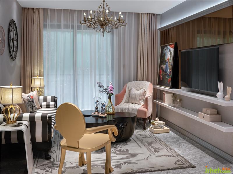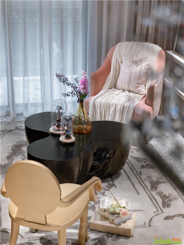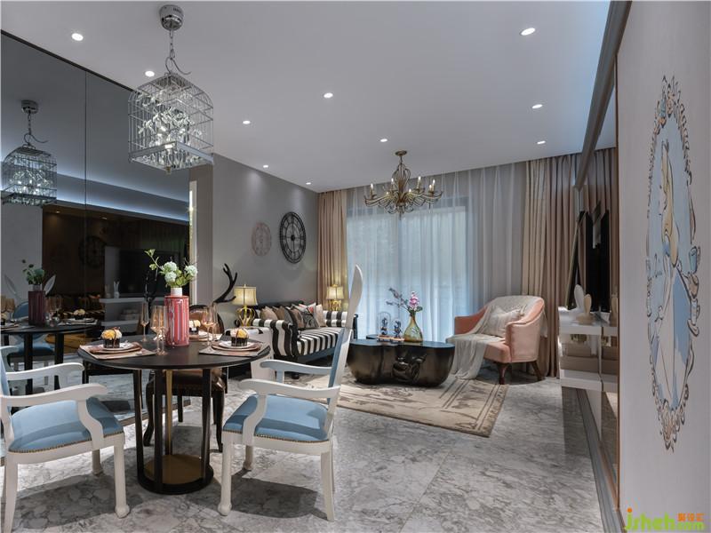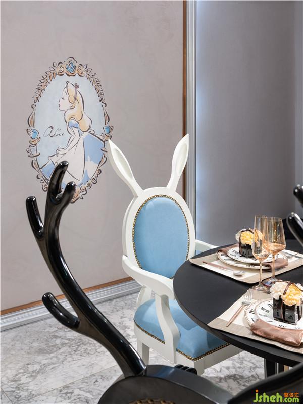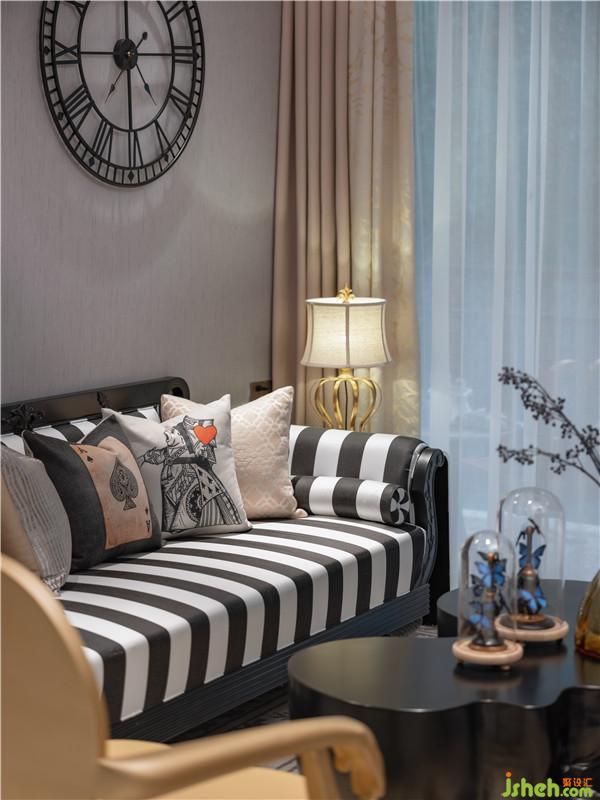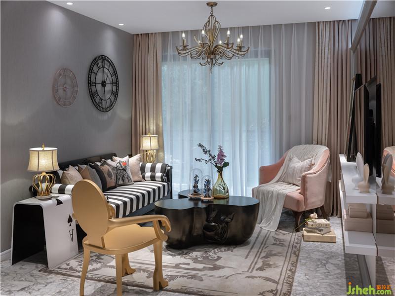 钟表形状的墙面装置、扑克梅花形茶几、粉色沙发、黑白条纹沙发、明黄色休闲椅、英式烛台形吊灯......仿佛下一秒大脑袋的红皇后就会出现在眼前。这些元素的搭配是风格的碰撞,更是现实生活与幻理想世界融合。深圳装修公司