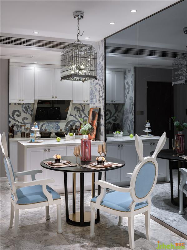 餐厅区鸟笼外框的水晶吊灯,拨转时钟的吊针,兔子先生再也不会被迟到困扰。镜面照映,仿佛定格在森林的幻象之中,长出兔子耳朵、鹿角的餐厅座椅与鸟笼是森林中格格不入的外来者,是掩藏在荒诞不经外表下的梦境。深圳装修公司