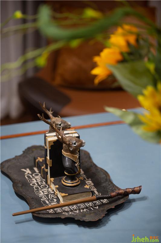 魔法书拼就的墙面、复古做旧的行李箱矮几、猫头鹰底座台灯、星象仪吊灯、各式南瓜小饰物......粘连起客厅的魔法元素,经由魔杖“施咒”,组合成一个有趣的魔法休闲空间。深圳装修公司