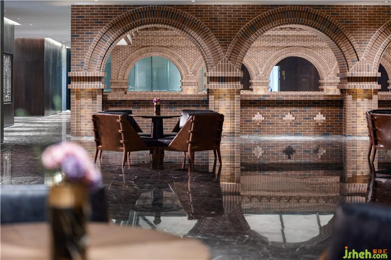 拾级而上,圆拱形的红砖墙面延续了第一眼的英伦视觉触动,同时从浅层初印象纵深到对商业价值的深入思索,设计师借由软装美陈在空间中做艺术氛围与商业价值的平衡术表达。