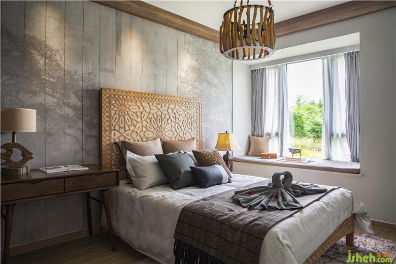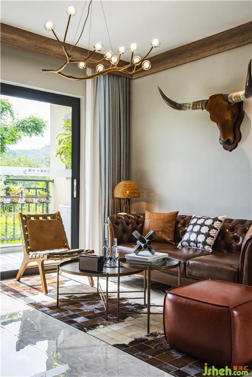 空间在设计时以自由大方为主。居家中的空间多采用的是流畅的线条来装饰的,家居空间多是以功能来划分的。空间的整体布局主要以没有原则为原则,能够表现出牛仔装饰风格的自由与热情。客厅演绎了与众不同的气息,复古的质感在这里弥漫。西部天然的石拱,巨大的峡谷,迷人的沟穴,风化而成的奇形崖壁汇成一种标示,经过数百万年时间侵蚀的柔软砂岩点缀在客厅,岩石纹理抽象而梦幻,那是众神的杰作,突兀峥嵘,色彩鲜明。样板房设计
