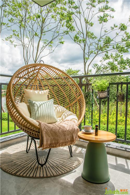 坐在阳台的吊椅上