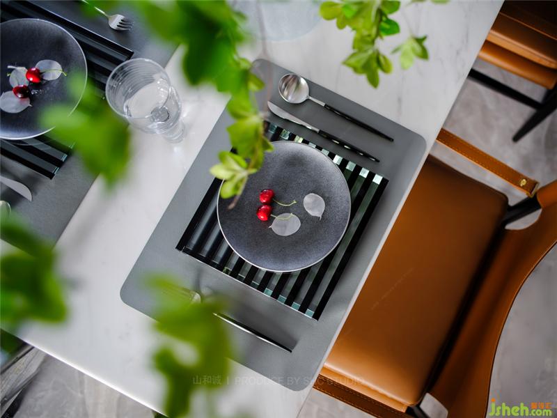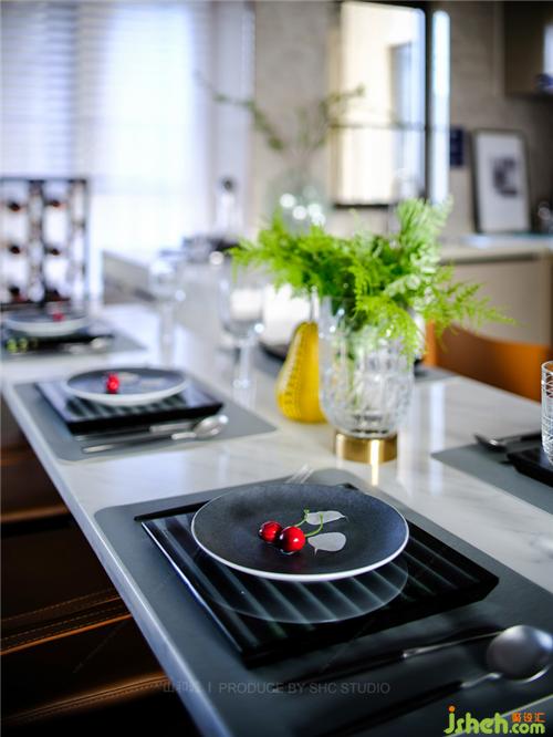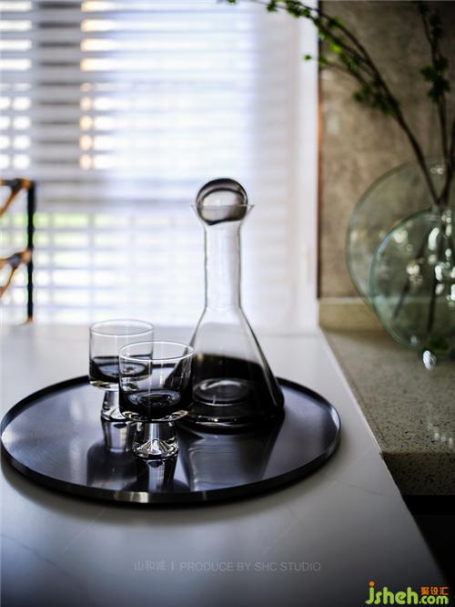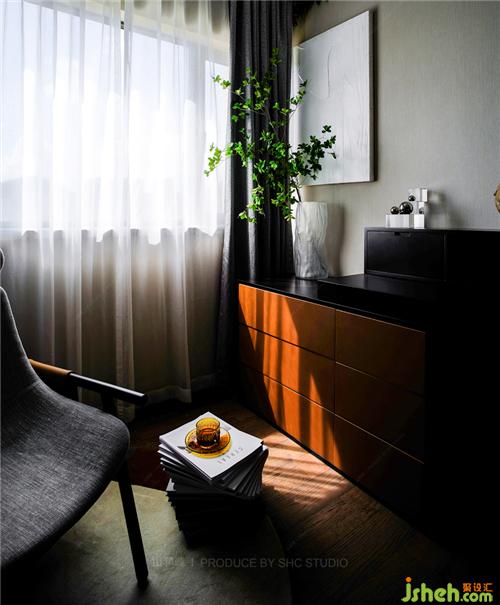 灰色空间沉稳大气,大理石透过光线折射出精致向上的生活态度,而爱马仕橙色的配件则赋予空间尊贵的气息。帘影斑驳,摇曳生辉,于朦胧中,享一方宁静与奢华。