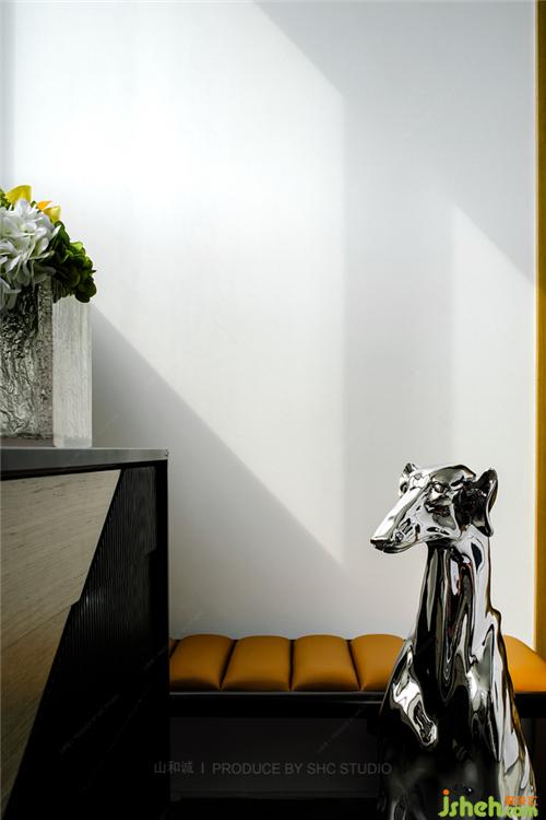 冷元宝先生使用爱马仕橙色系加上高级灰铺染出空间高端优雅的精致之气,黑白相间的大理石墙壁颇具流动感,艺术感十足的花瓶、生命力旺盛的绿植,点缀其间,层次分明,豪华的质感和整个圆滑的轮廓,无不彰显出主人高雅的品味。