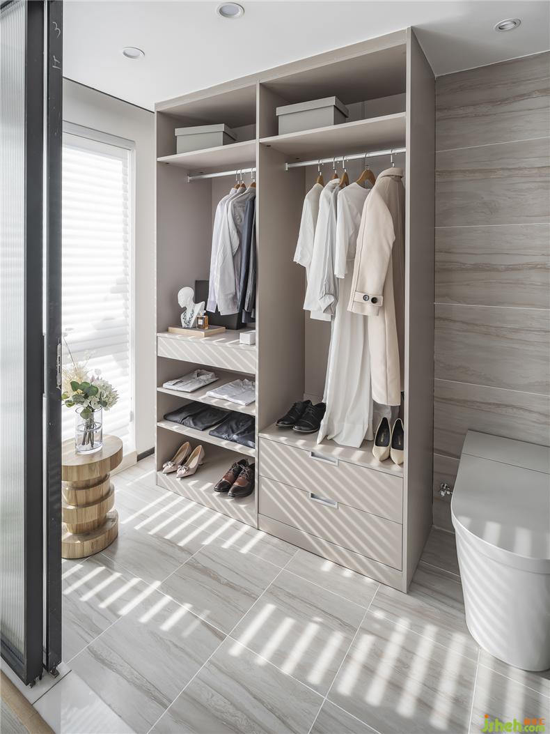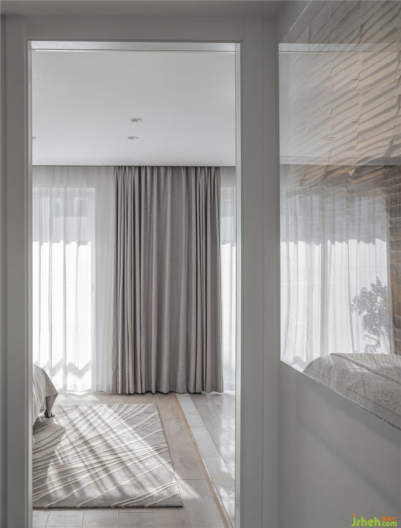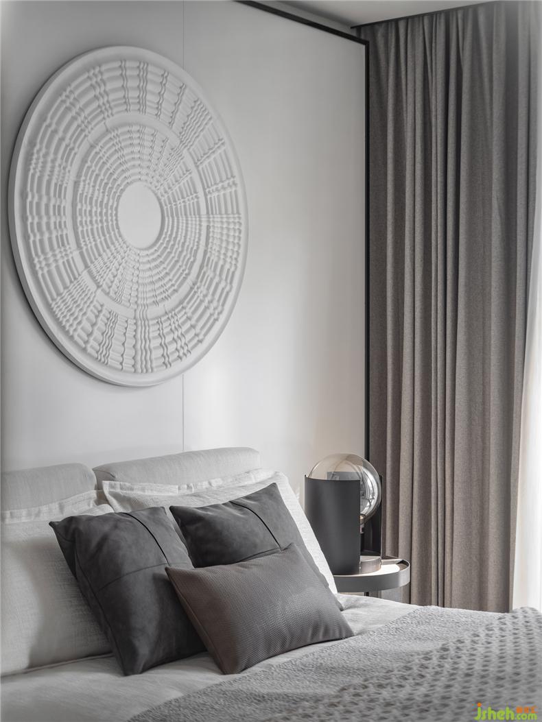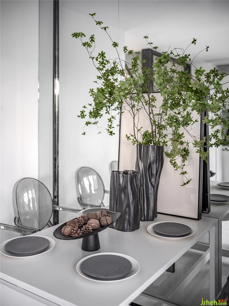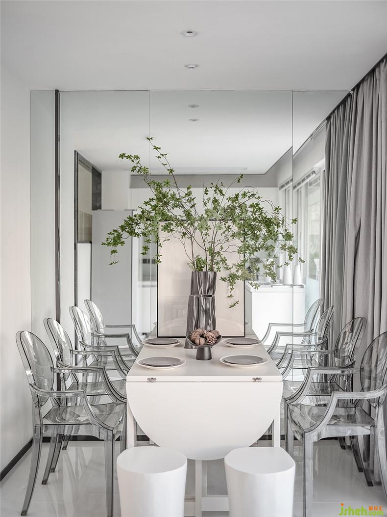 富有艺术气息的透明山水茶几,水晶质感的透明座椅,样板房设计自然光经过折射的加工变得更为柔和,中和了侘寂风中自带的清冷孤傲。