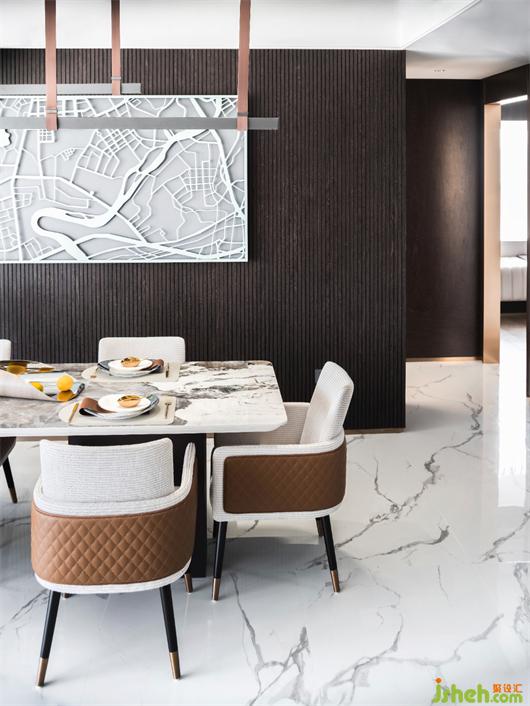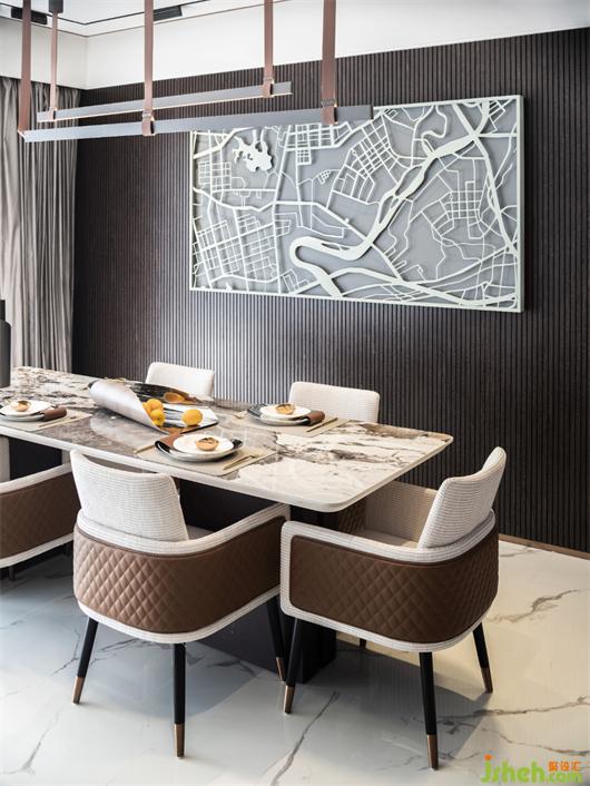 客餐厅是空间的第一印象,金属装置画点缀于此,以城市地图为设计概念,使用金属切割工艺形式,将美的未来中心的地缘位置化于形,丰富空间语境。