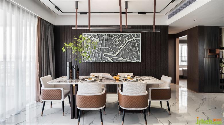 空间以棕色为底色,搭配舒雅的高级灰,布艺与皮革材质、间或点缀的金属元素拉伸出丰富的空间层次。样板间设计跃然眼帘的客厅空间以一种高于生活的姿态,散发出城市会客厅的高级质感,表达着主人对极致摩登的追求。