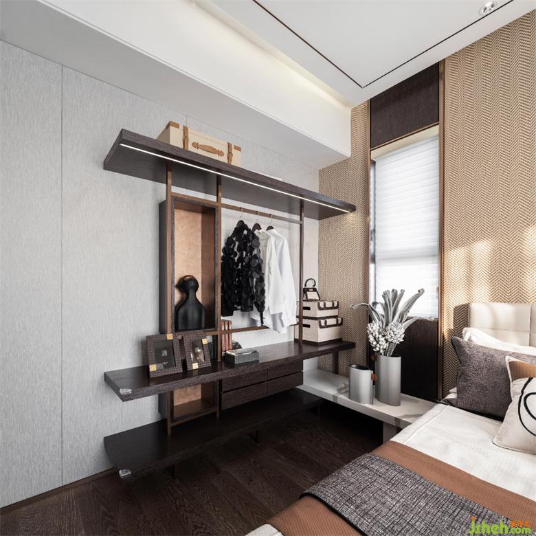 老人房则用简洁明净的温暖基调诠释舒居体验,墙纸采用了特别的纹路与材质,床头艺术装饰无言诉说着累积的岁月。样板间设计床边开放式置物衣架调和了空间的气息,带来优雅的品质感,同时使空间更具备实用性。