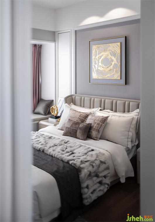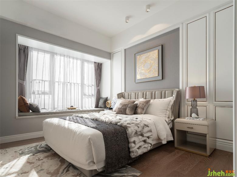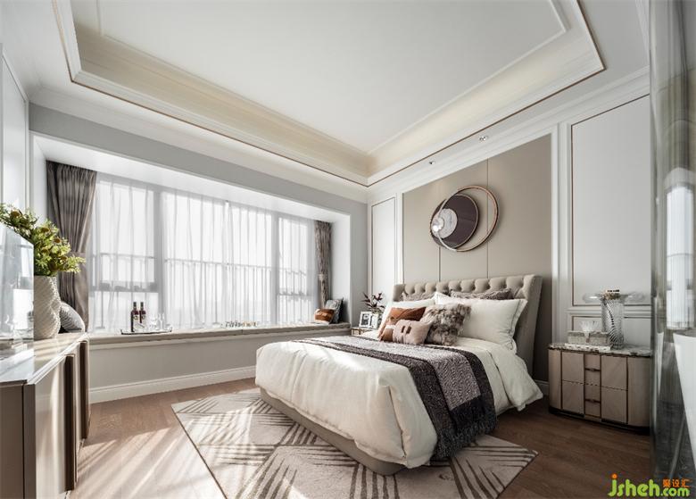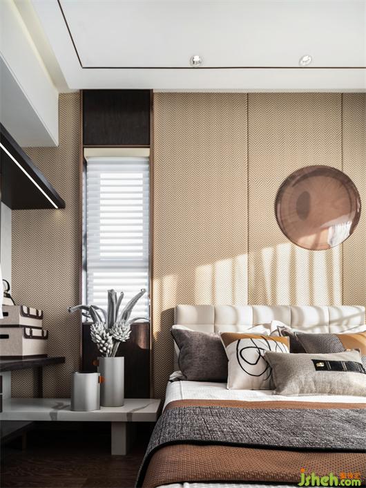 主卧床头艺术装饰运用金属与石材的搭配,强烈的时尚属性表达了主人的生活态度。暖阳自开阔的飘窗洒照射进来,在空间内停驻,捕捉生活中一个个灵动瞬间。