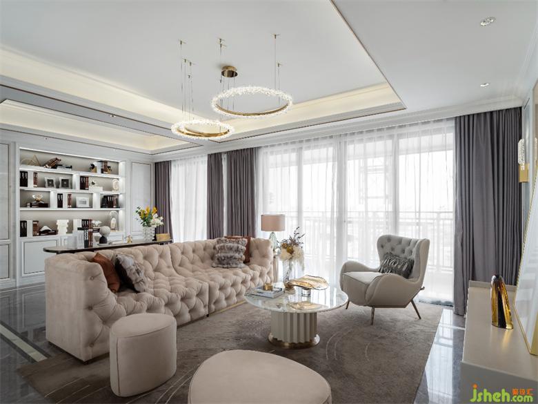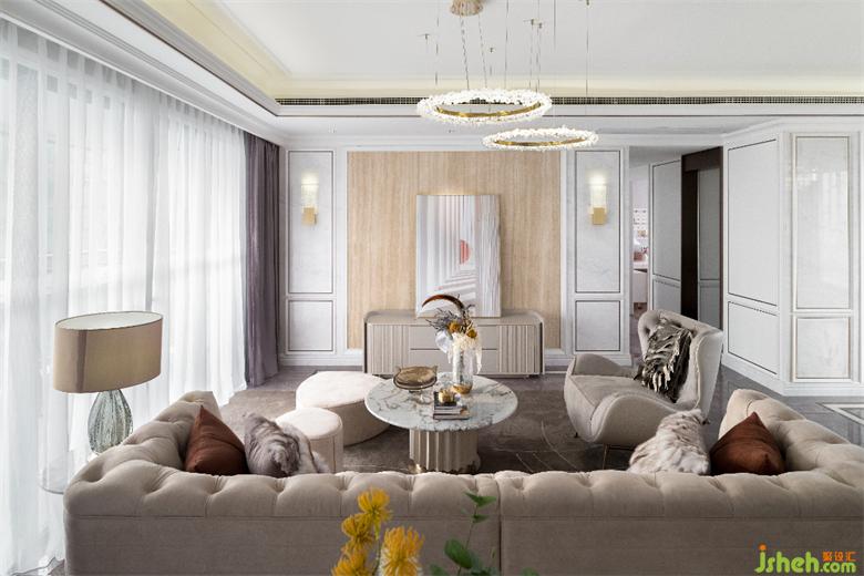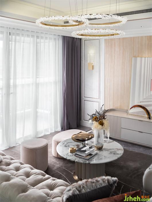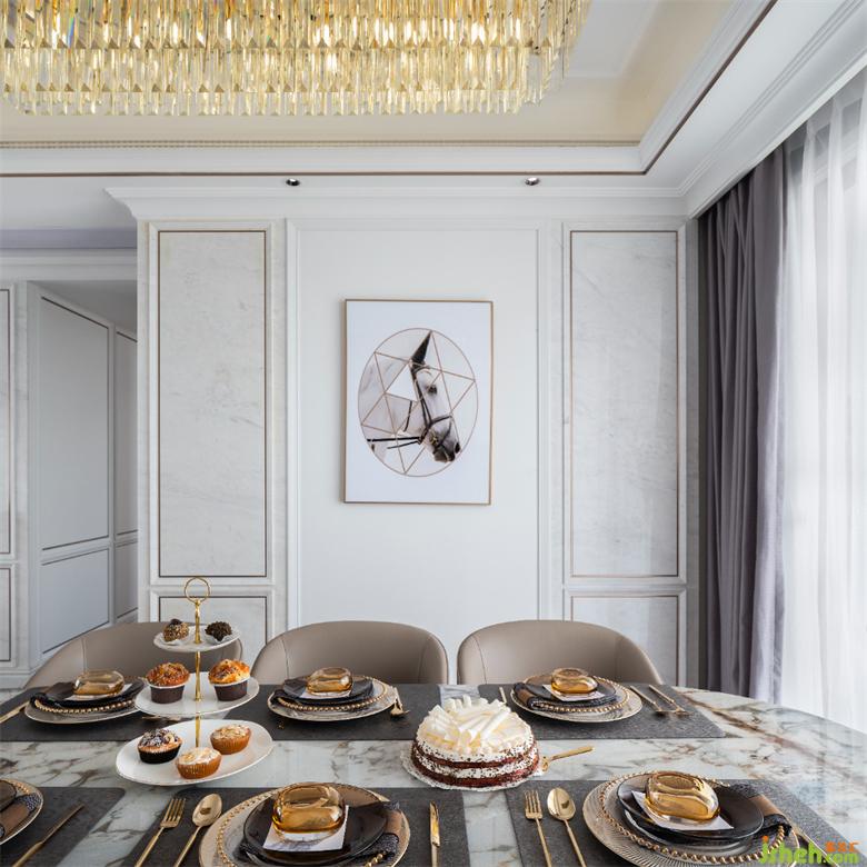 在本案中,设计师使用温暖舒适的调色板,注重石材、木艺等多种材质与美感的结合,样板间设计细描居所的温暖,奠定了优雅浪漫的欧式风基调。