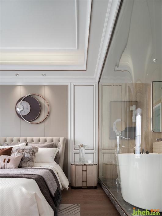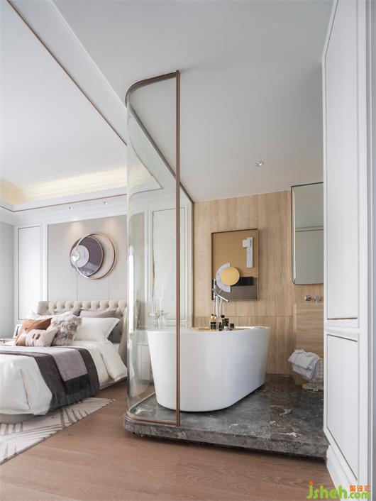 主卧浴室大面积采用玻璃,让整个空间更显通透,大理石地板与木地板碰撞,带来精致质感。