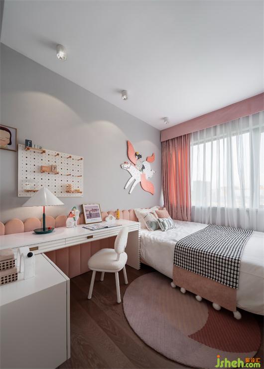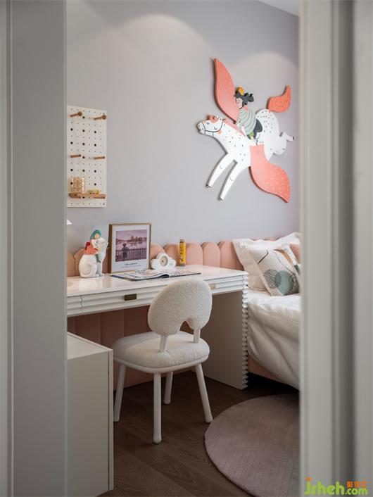 儿童房用色甜美梦幻,采用马卡龙色作为主基调,灰色墙面点缀女孩骑白马飞翔装饰,搭配一副俏皮装饰画、清新洞洞板收纳,打造出一个清新甜美、纯真烂漫的女孩居住空间。