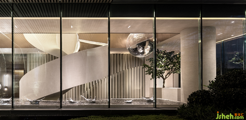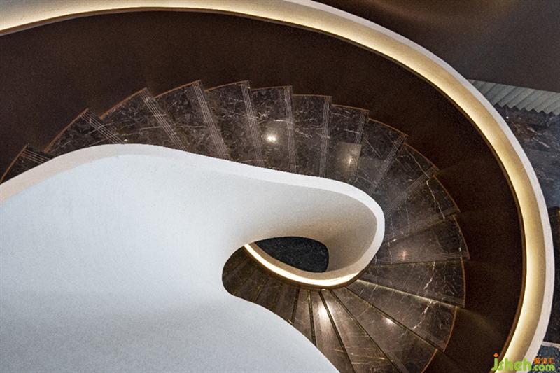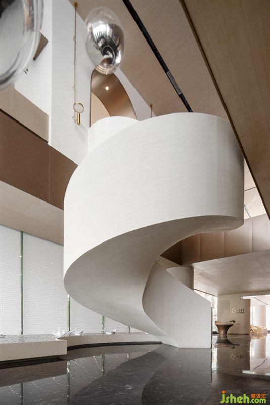 “真实”水纹下“溅起的陶瓷水花”,将日常元素提炼成艺术的一部分,设计对形式的简化通过一种“表演式”的情景,将空间环境纳入到艺术之中。楼梯的曲线与立面的线条相呼应,微妙的旋转指向性、曲线下沉的弧度、咖啡吧台的焦点所在,都暗示了某种好奇心的连续探索。