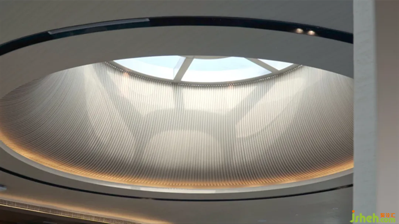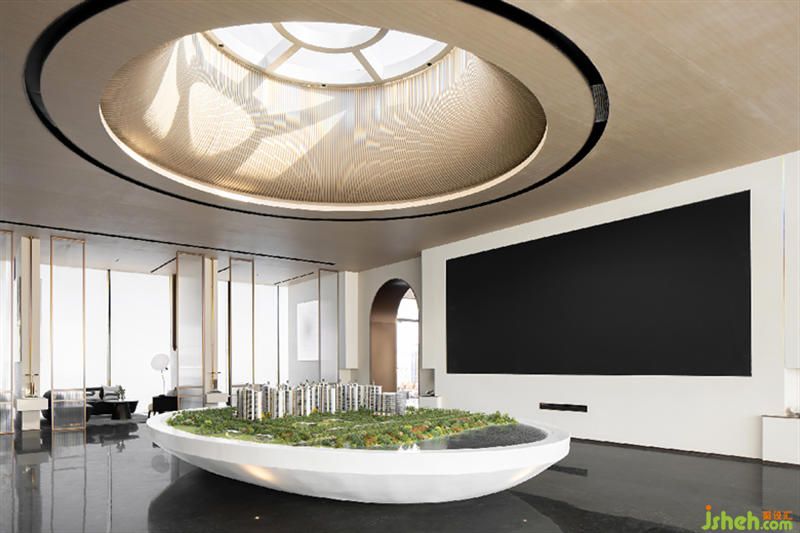 样板房设计通过圆形天窗,和其中心轴线下“平地升起”的鹅卵石般的椭圆形沙盘,设计师将两者微妙地联系在了一起。圆润中的四平八稳、顺应自然,我们被从上至下的隐喻所打动。
