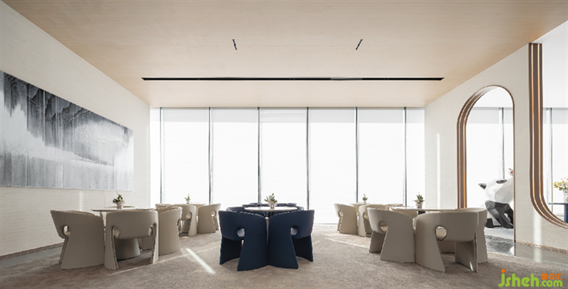 二楼的公共空间,海浪的意象进一步深入其中,它未必需要表达崇高的、出世的一面,相反却可以是轻松和精致的,也就是更为入世的。它通过酒店式的奢华体验,和美术馆般的艺术调性,鼓励了某种更为自然、艺术、精致的生活方式和价值观。