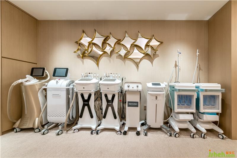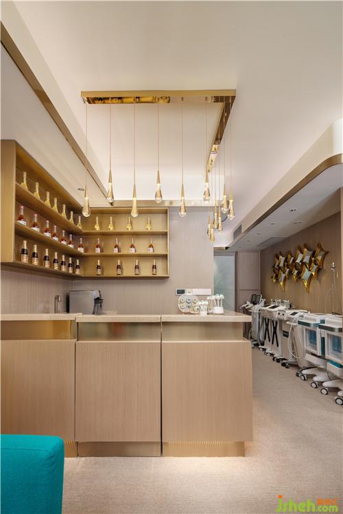 客人一出电梯,映入眼帘的是金色拉丝钢板造型,水晶发光字“术妍美”LOGO,推开高大气派的铜门,是简约精致的前台接待,业主在前台上空特别挑选了女人味十足的轻奢装饰水晶灯。深圳美容会所设计前台左边是一排整齐摆放的各种进口医疗美容器械,休息等候区更是被不锈钢产品展示架一分为二,方便业主接待不同的客人。小吧台小巧精致,吧台上方晶莹剔透的吊灯更让会所别有一番格调,吧台后整齐摆放各式各样的果酒及调味酒。业主为客人精心准备了各式糕点、精心炖煮的燕窝、现磨咖啡等,给客人提供尊贵的服务。美容顾问室更是洽谈和社交的私密空间,U型办公台方便美容顾问工作,旁边小水盆更是特别贴心,每次和客人做皮肤检测时,先洗手,客人也更加觉得卫生、放心。