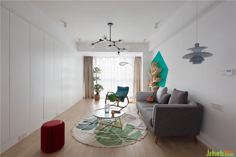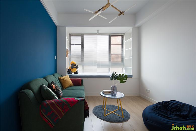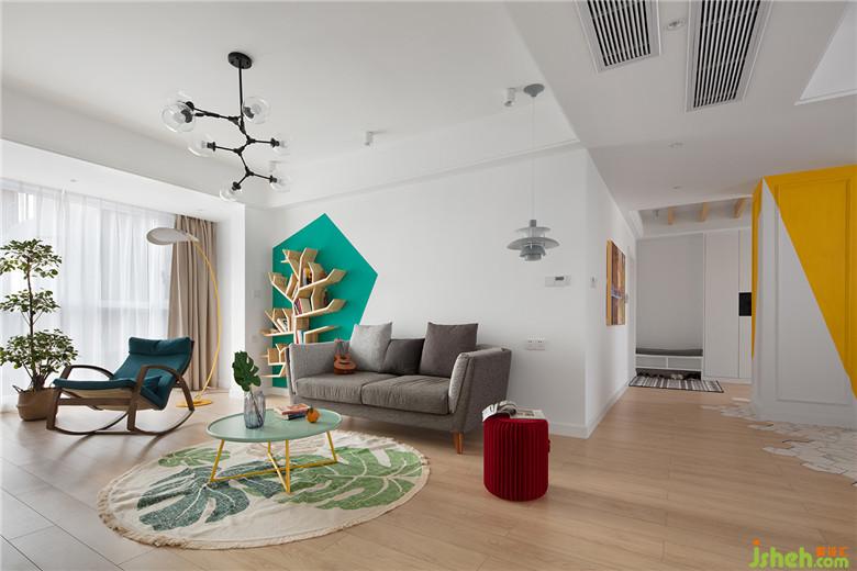 沙发左边的树形书架,室内设计师给它刷了绿色背景,家具摆放都很随意,不设限更舒适。