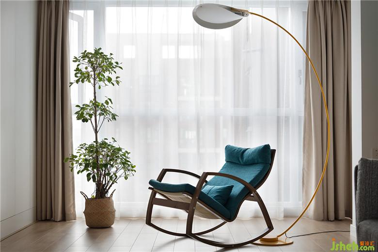 客厅把阳台空间收进室内,一把摇摇椅,一盏简约落地灯,一个休闲角。