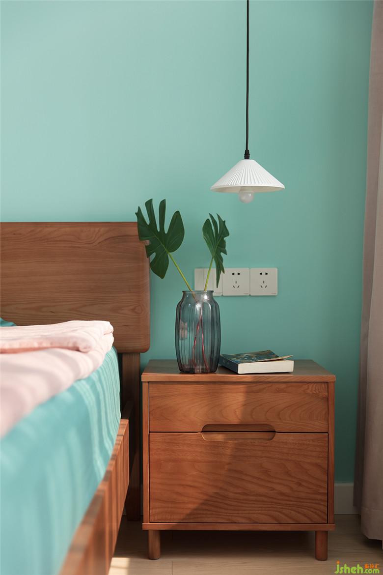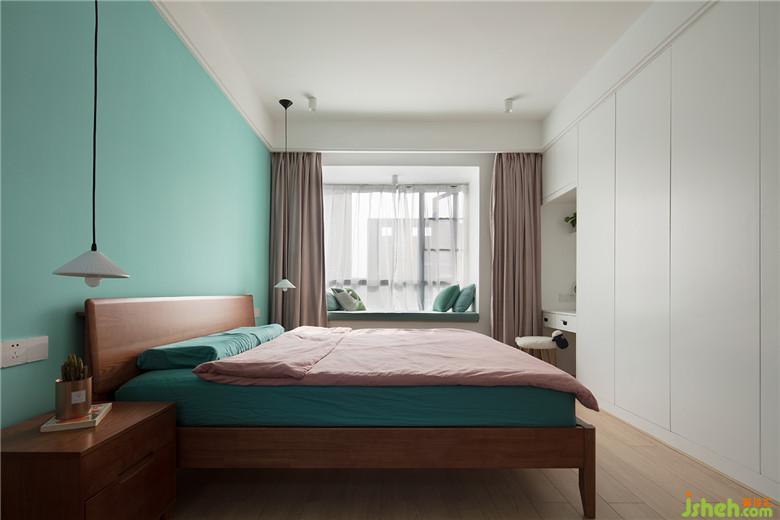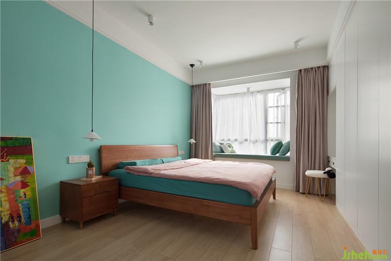 主卧室配色清新,大面积的纯色搭配,素净简洁,看着干干净净的很舒服。