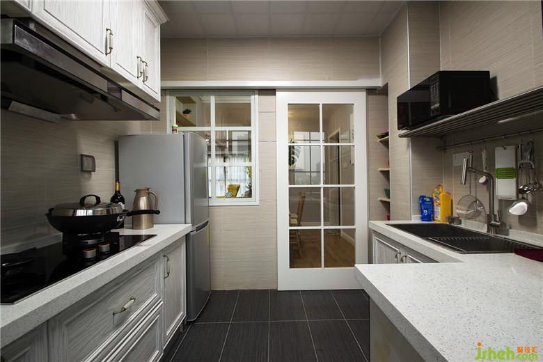 厨房也只有五平米,格局大变身后塞下了四米五的橱柜还能放下冰箱。室内设计师改用吊趟推门的方式,节省了空间。
