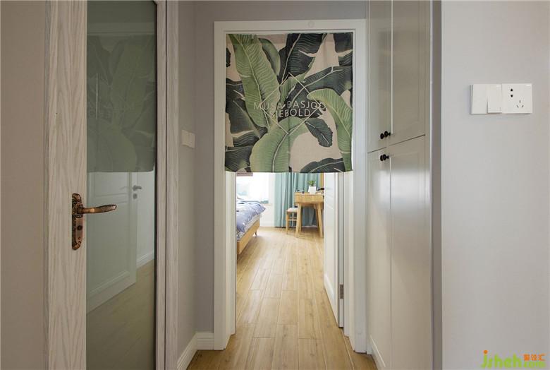 左边是卫生间,右边是电视墙后的储物柜,拨开门帘就是主人房。