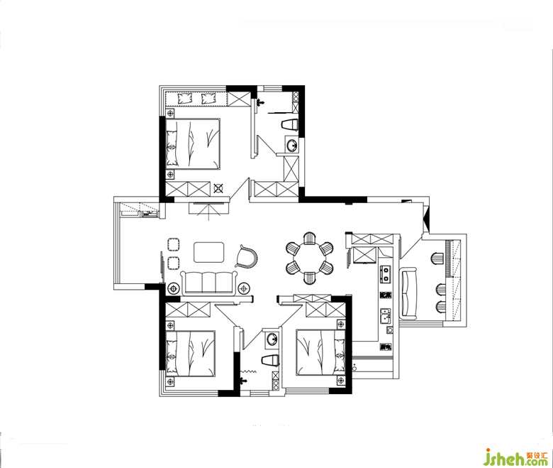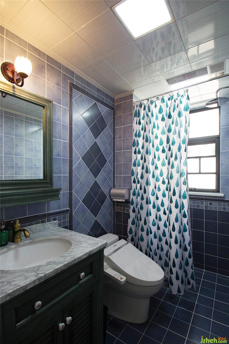 ▲ 卫生间采用深蓝与浅蓝的瓷砖来拼贴造型,浴帘上的绿色雨滴点缀了空间
