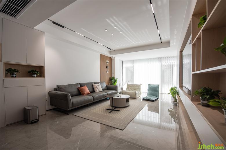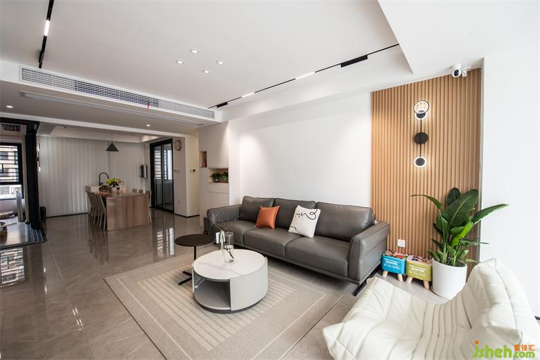 空间以白色及木色调为基底,大平层装修设计搭配灰色的皮质沙发、梦幻帘,在良好的采光下营造出透亮洁净的视觉感受。