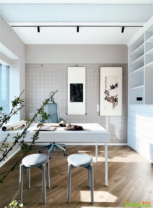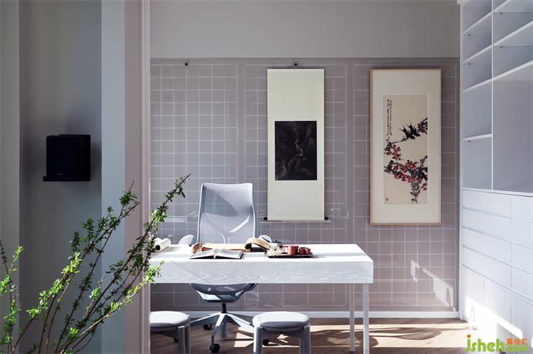 背景墙用上了精心设计过的定制网格图案面板比例方格玻璃便于男户主可以构思画作构图,并用磁性玻璃覆盖,让男户主可以轻松“挂”起初稿艺术品,调整尺寸和框架。墙上挂上男户主最珍贵的艺术收藏“蓝瑛”的作品。