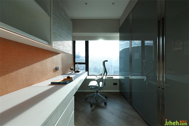 由于他们希望充分利用自然光和城市景观,夫妇在客厅也决定不使用窗帘。由于缺乏软装饰,廖奕权认为公寓的声学舒适性可能会受到影响,于是他提出使用吸音壁纸(而不是最初的灰泥饰面)来防止更大的空间产生回声。