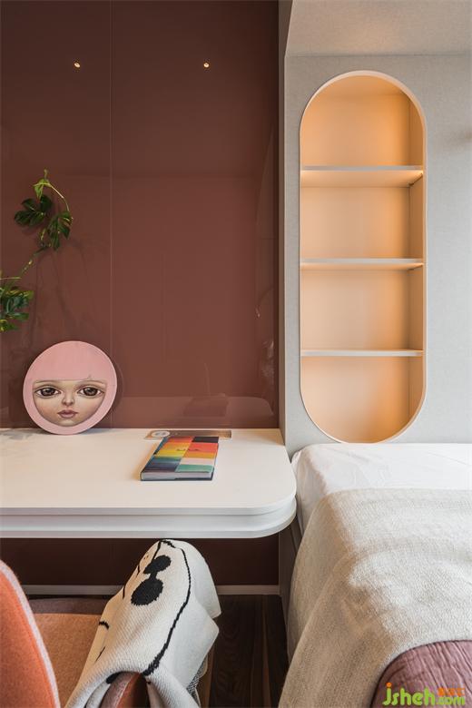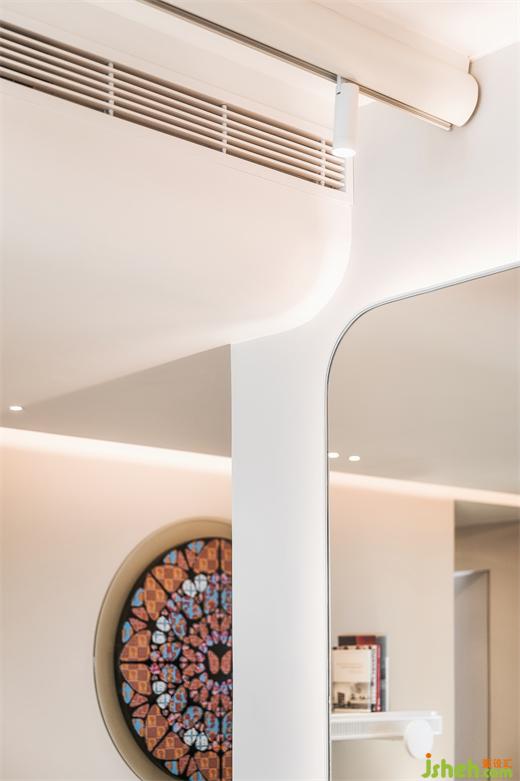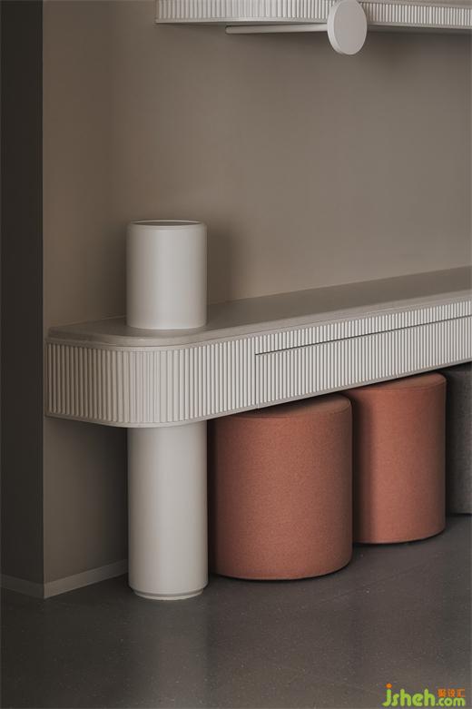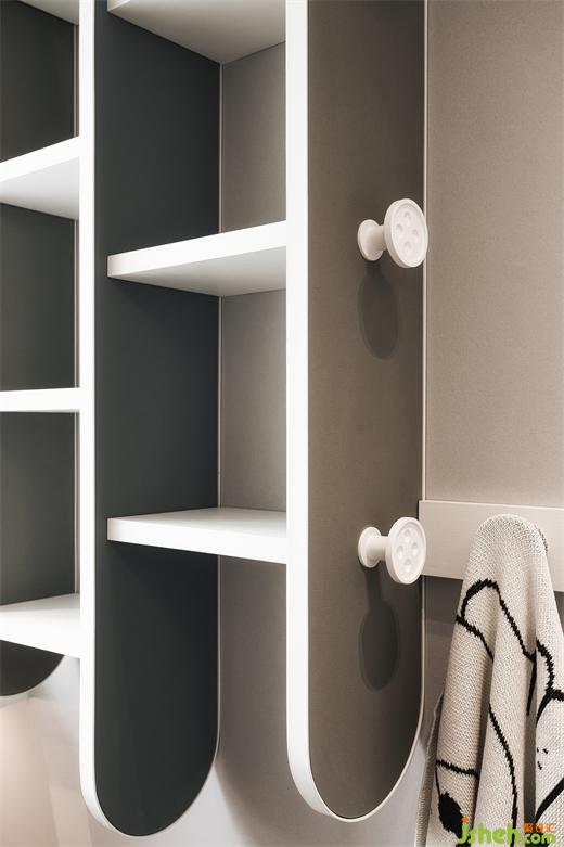 本案属于一个年轻的四人家庭,户主夫妇不满足于寻常俗套的设计模式。 最后他们挑选了对空间及艺术均拥有过人触觉的设计师全权为新居进行规划。 单位间隔作为整体设计的重要 框架,设计师今次亦从平面图开始,以宏观的角度,为居者塑 造最实用适意的生活空间。 首先,玄关旁边的厨房面积较大, 设计师将部分空间规划出换鞋区及鞋柜,从而丰富空间机能。 另外,玄关区以一高一矮的挂墙抽屉柜作为空间的过渡与后续,同时为常用小物及药品等提供方便的收纳位置。