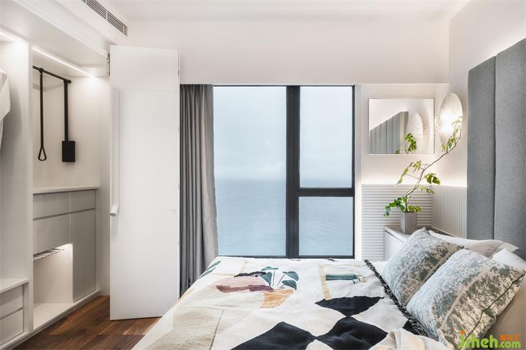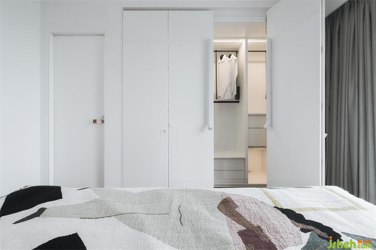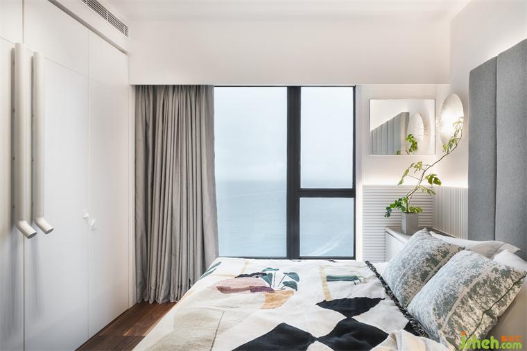 1.床头的灰色扪布及软装元素,丰富了简约的纯白空间。 床头柜刻意加高,方便户主取放书籍读物。