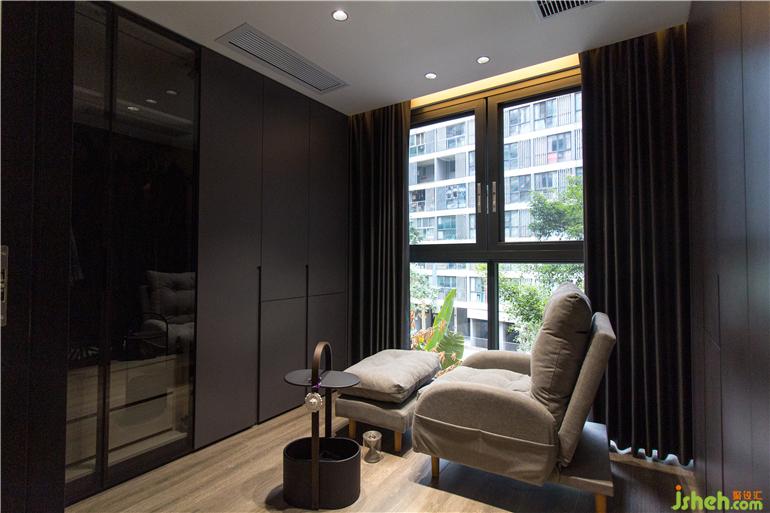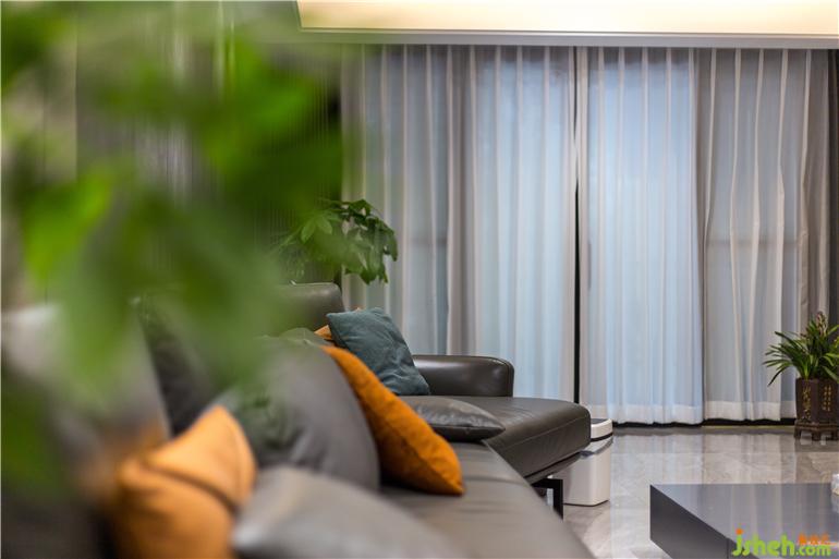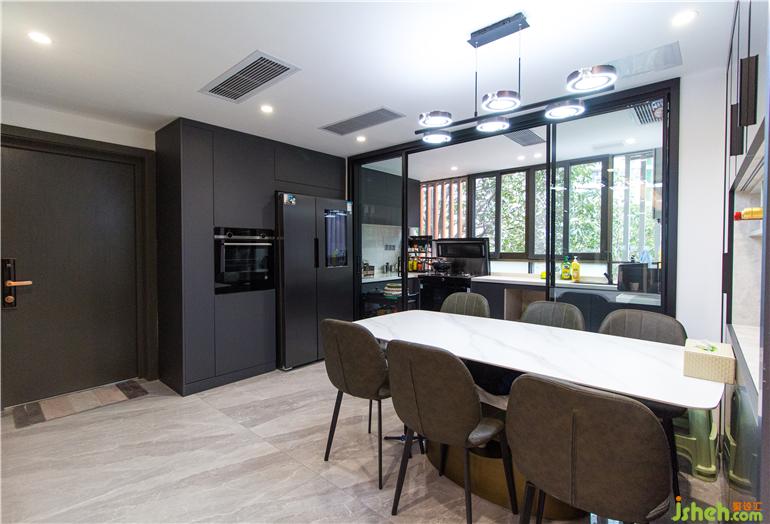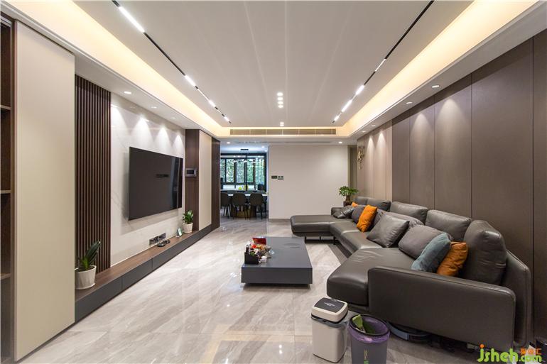 深圳现代设计空间上选用具有现代质感的材料设计,内敛的哑光材质,相比于闪耀的亮面材质,更加凸显空间质感。深浅咖色的木质背景色和白色的大理石颜色形成鲜明对比,展示性丰富的柜体立面,整个客厅给人眼前一亮,营造出大气的空间氛围。黑色的意式皮沙发与极具质感的黑色布艺窗帘,跟餐厅的电器柜相互呼应,整体色调和谐统一,彰显品质。宽阔的空间格局,通透明亮,黑色的色调设计在这里一点都不压抑。深色配色风格中,极具视觉张力的色彩,构成刚刚好的空间温度。