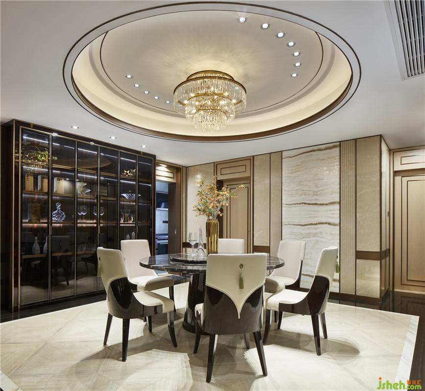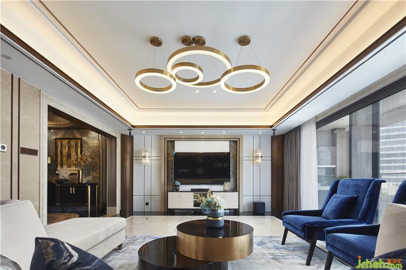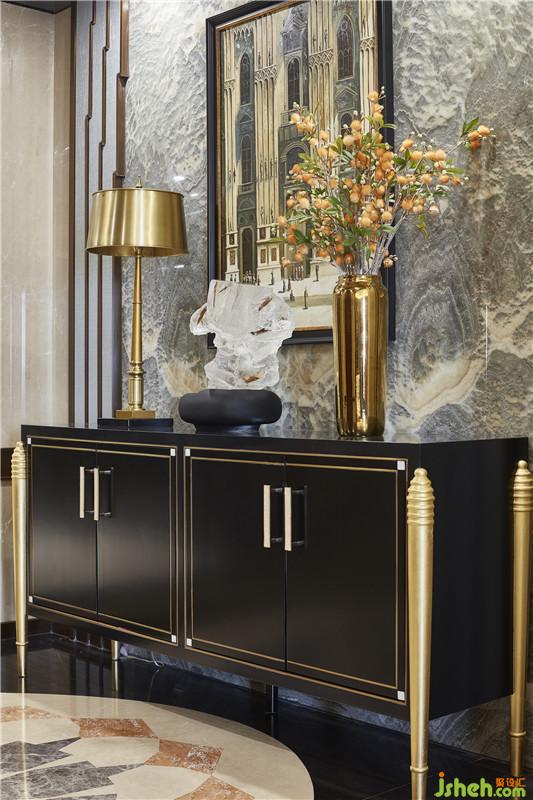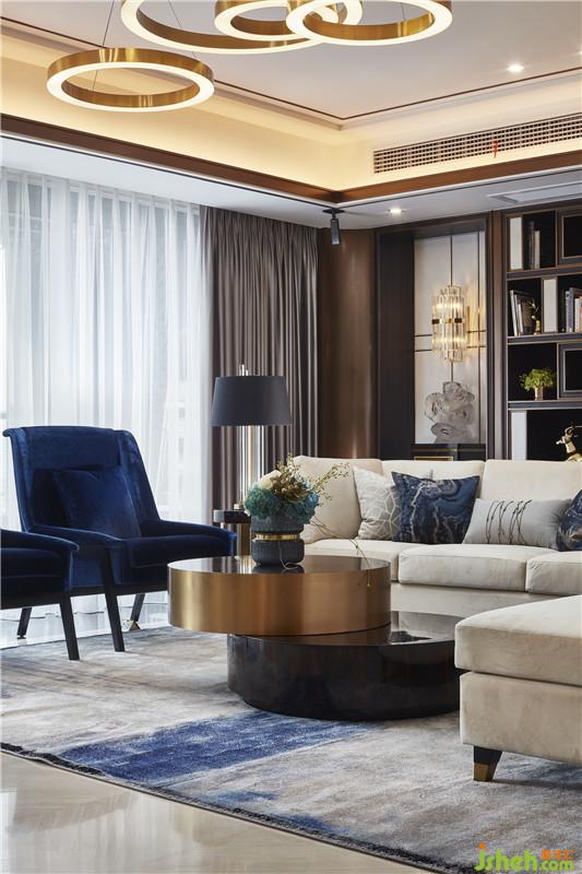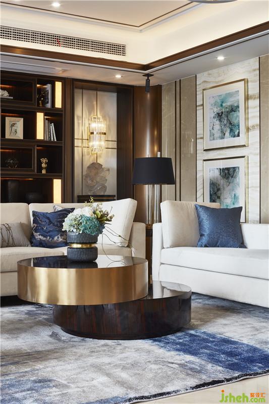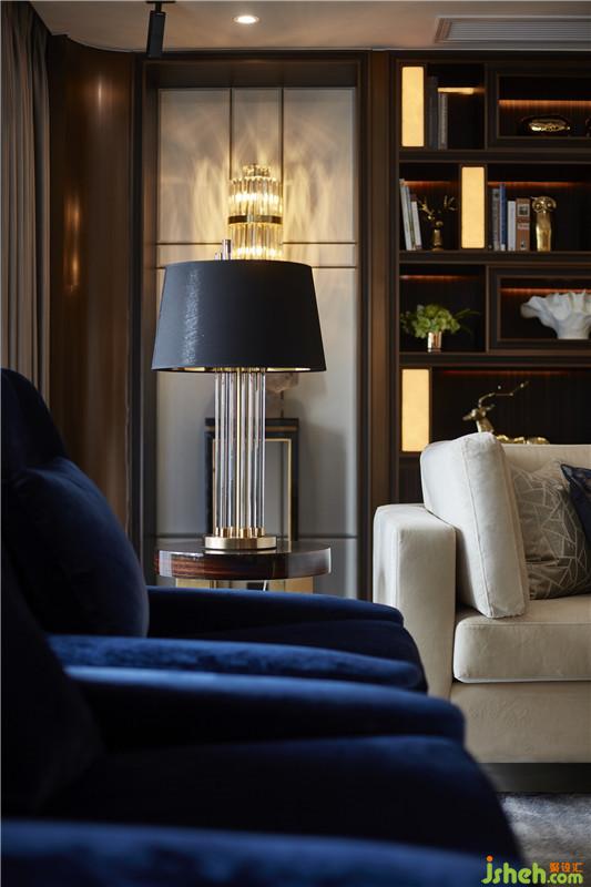 客厅家的中心,整个空间的布置,家具,软饰等,无一不展现出一种轻奢的刚阳的混搭风格,令人过目不忘。深蓝色布艺和金属色艺术装置,不仅贴合整体空间的设计主题,而且营造出一种品质高雅的气质。细微之处见真章,水纹肌理的石材,水晶里枝叶细瓣的美好,在精心的布置下于无声处在牵引着来客的情绪。
