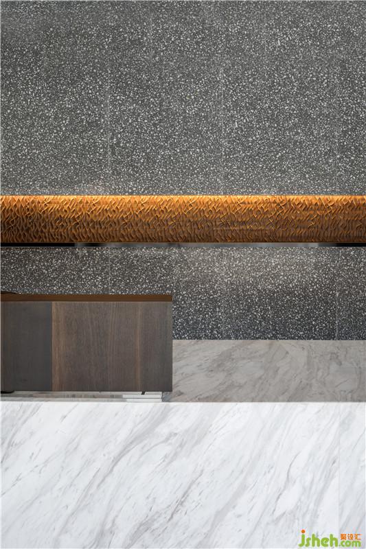 背景墙和会议室也采用同样的空间置入方式,如图所示。此理念从建筑外立面到室内再到空间的立面和陈设等都呼应了榫卯规律。楼梯扶手采用一通到顶的铁艺,简化空间线条,增加立体感。设计公司