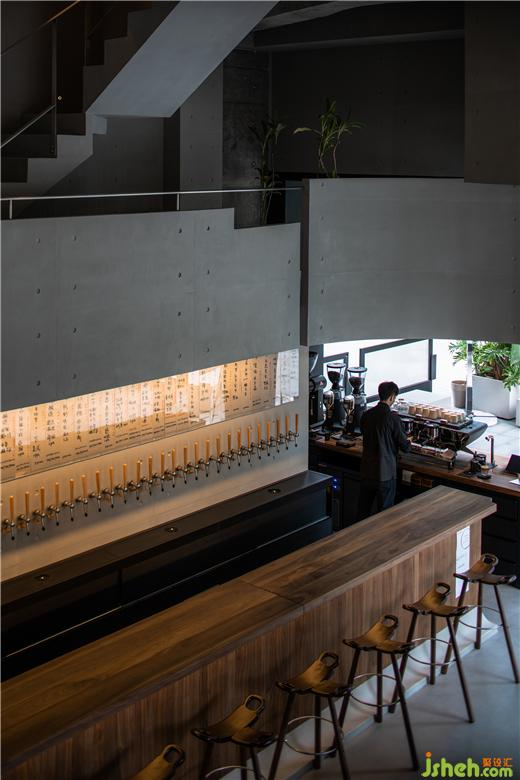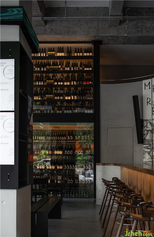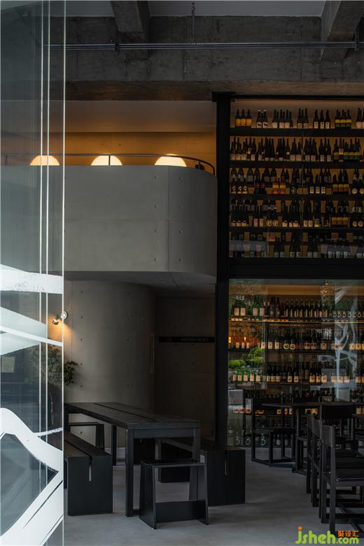 在这个雕塑感强烈的、有着通高天花板的空间内,空间的尺度关系从一般经验中被放大,成都药厂精酿酒吧设计为了增强这种大尺度的戏剧体验,设计上利用垂直空高的优势,将酒类陈列于室内视觉的开放区,形成一个立体的、矩阵式结构的6米高玻璃酒房。人在酒房的状态,既体现为一种对空间尺度的丈量,也暗合着一种对酒精烈度的丈量。