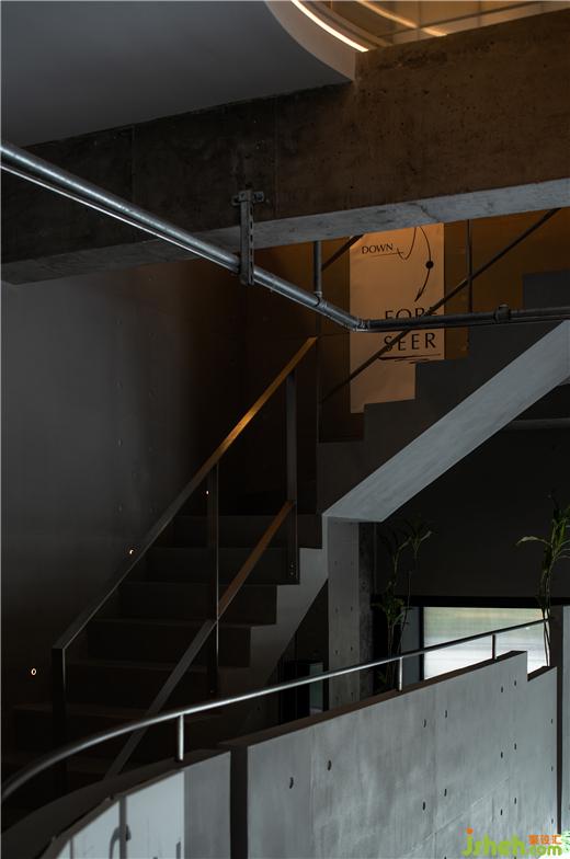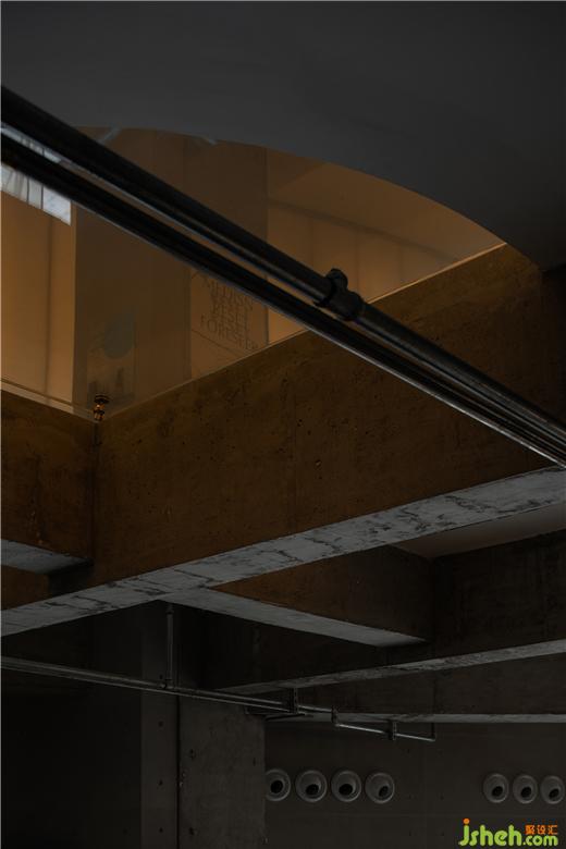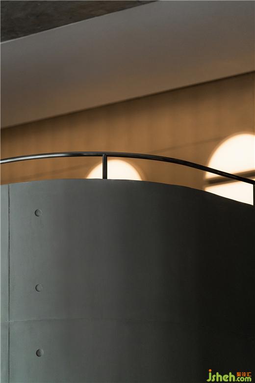 成都药厂精酿酒吧设计通过向上探索,一切空间细节在近距离的身体经验中慢慢向外展开:墙面由有着细腻质感的水泥板拼缀而成,圆形的孔洞元素开始连续地进入视野,夹层外侧的弧面水泥栏杆平衡着空间的硬朗,顶面裸露的混凝土梁柱结构以及金属管线提供了一种既有的真实,而天花板上巨大的圆形天窗则成为重要的视觉节点,宣誓着某种纯粹抽象的图景。
