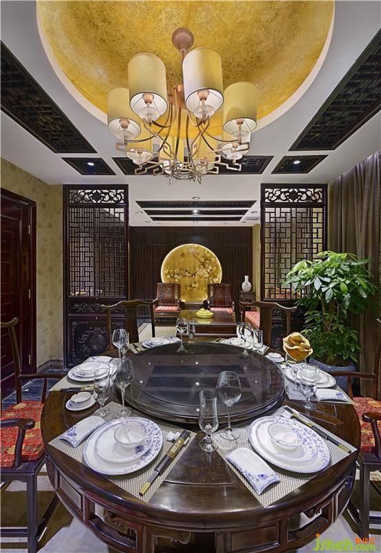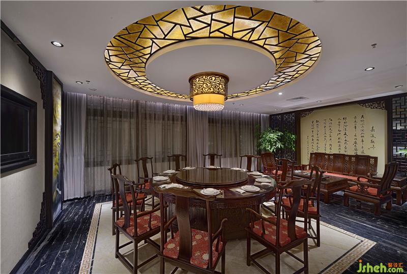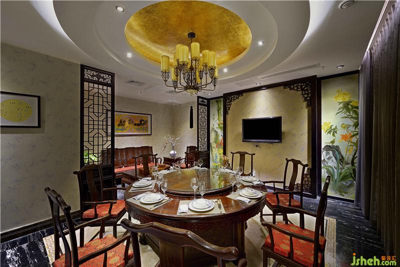 在可容纳20人用餐的大型包厢,空间宽敞且功能齐全。为了将空间营造出古典楼阁的氛围,吊顶也特意用木料装饰成木质屋顶的样貌。一副大型的用淡金色彩描绘的清明上河图装饰了整面墙壁,搭配上考究的红木中式家具,都向我们透露了这里低调的奢华。