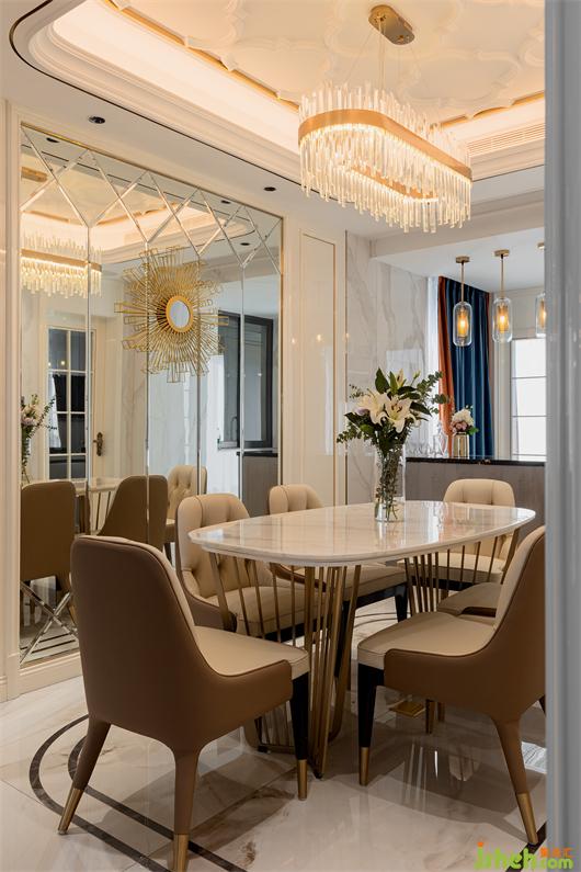 餐厅区域则以大面积的车边棱镜做装饰,镜子反射餐桌及餐桌上的菜肴,在视觉效果上使得食物更加丰盛。
