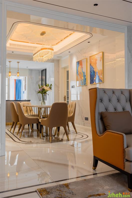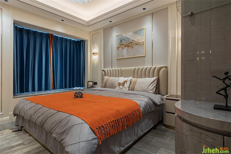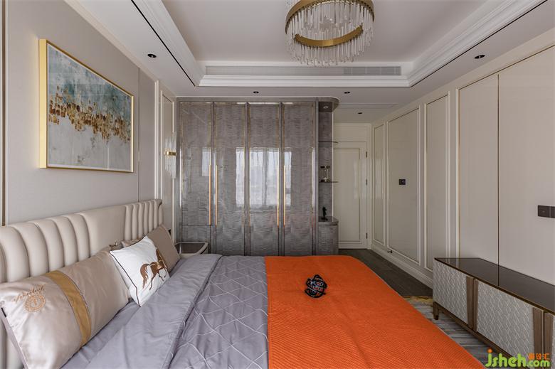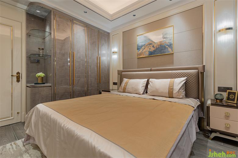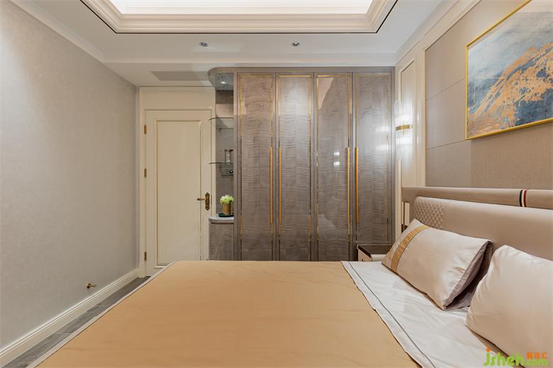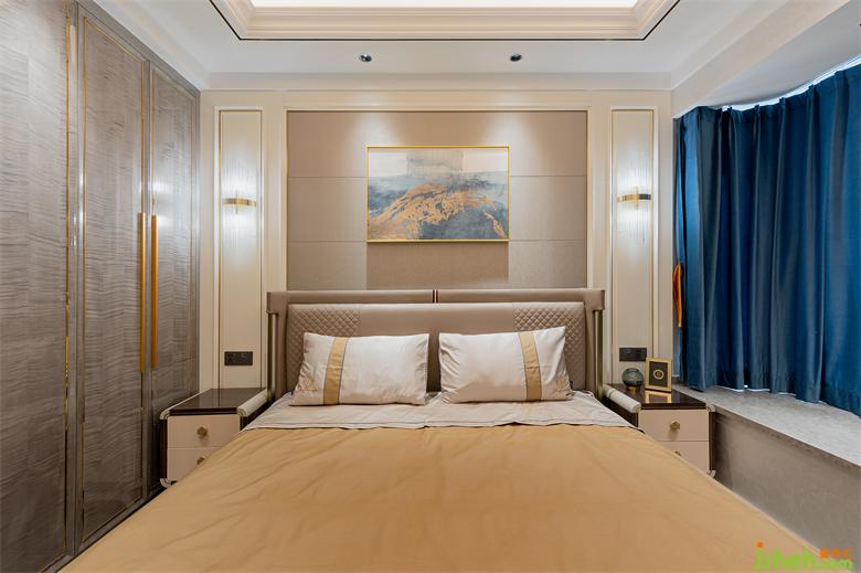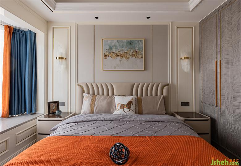大平层设计主卧区域以暖白色护墙板为主,床铺背景搭配素色硬包,艺术挂画、水晶壁灯及床品的合理搭配,既营造出温馨浪漫的休息空间,又使得整个主人房更加柔和、高贵、优雅。